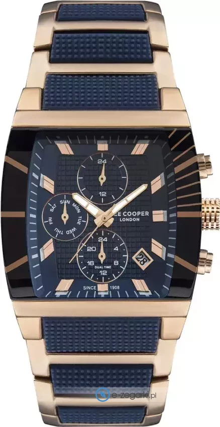Model LC07422.490 marki Lee Cooper to gustowny zegarek naręczny męski, który wyposażono w pomysłowe rozwiązania oraz funkcje. Charakteru nadaje wysokiej klasy tarcza w kolorze granatowym. Pokazana metodą analogową bieżąca godzina jest czytelna i łatwa do sprawdzenia. Koperta w odcieniach koloru różowo złotego szeroka jest na 39 mm.