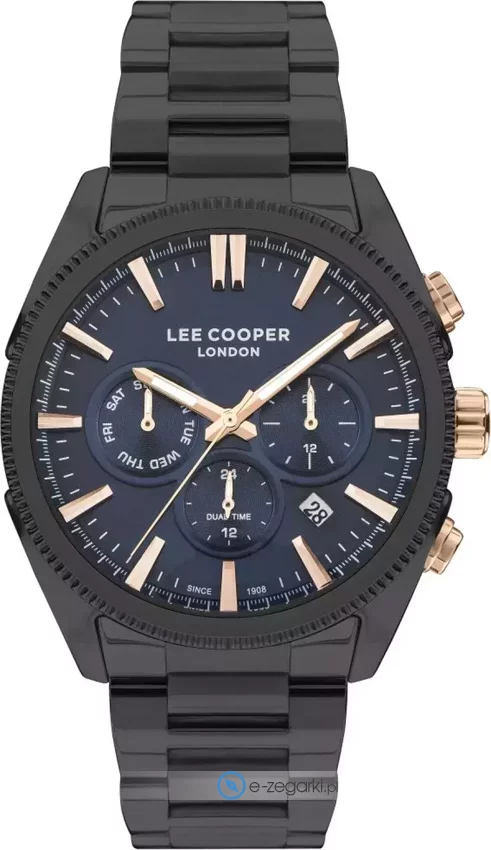 Model LC07479.690 marki Lee Cooper to elegancki zegarek naręczny męski, który posiada ciekawe rozwiązania i funkcje. Atrakcyjną budowę zegarka osiągnięto z pomocą tarczy w kolorze granatowym. Zegarek ten pokazuje aktualny czas w formacie analogowym dzięki temu odczyt jest bezproblemowy. Koperta została ozdobiona kolorem czarnym szeroka jest na 44 mm - ma okrągły kształt.