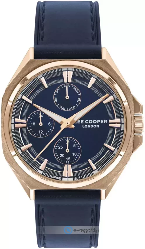 Zegarek męski LC07568.499 marki Lee Cooper to dobre połączenie funkcjonalności a także modnego wzornictwa. Charakteru dodaje wysokiej klasy tarcza w kolorze granatowym. Godzina przedstawiona jest w sposób analogowy co niezmiernie łatwo pozwala ją odczytać. Koperta jest w kolorze różowo złotym szeroka jest na 44 mm - w kształcie okrągłym.