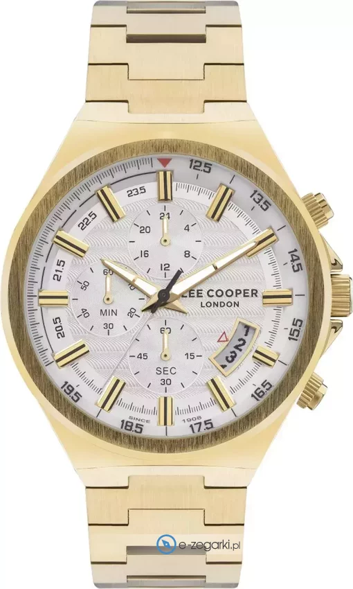 Męski zegarek Lee Cooper LC07717.130 to zegarek, który dzięki swemu wzornictwu zawsze będzie prezentował się dobrze. Charakterystyczny wygląd zegarka osiągnięto także dzięki tarczy w kolorze szarym. Aktualna godzina pokazywana jest w sposób analogowy co niezmiernie łatwo pozwala ją odczytać. Koperta jest w kolorze złotym szeroka jest na 45 mm - ma okrągły kształt.