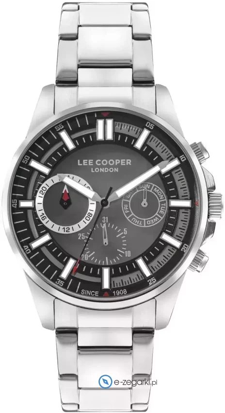 Męski zegarek Lee Cooper LC07817.350 to zegarek, który dzięki swemu wzornictwu zawsze będzie prezentował się dobrze. Ciekawą budowę zegarka uzyskano dzięki tarczy w kolorze czarnym. Zaprezentowana metodą analogową aktualna godzina jest czytelna i łatwa do odczytania. Koperta w odcieniach koloru stalowego szeroka jest na 45 mm - w kształcie okrągłym.