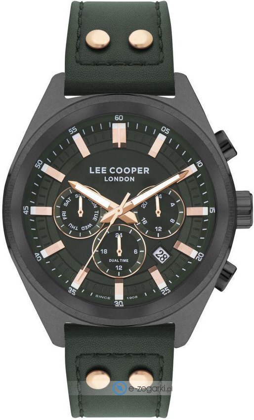 Zegarek męski LC07842.077 marki Lee Cooper to stylowe połączenie funkcjonalności oraz modnego designu. Ciekawą stylistykę czasomierza osiągnięto z pomocą tarczy w kolorze zielonym. Zaprezentowana metodą analogową bieżąca godzina jest czytelna i prosta do odczytania. Koperta jest pokryta kolorem stalowym szeroka jest na 45 mm - ma okrągły kształt.