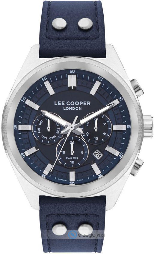 Męski zegarek Lee Cooper LC07842.399 to zegarek, który dzięki swemu wzornictwu zawsze będzie prezentował się dobrze. Atrakcyjną konstrukcję czasomierza osiągnięto dzięki tarczy w kolorze granatowym. Pokazana metodą analogową bieżąca godzina jest czytelna i szybka do sprawdzenia. Koperta w odcieniach koloru stalowego szeroka jest na 45 mm - w kształcie okrągłym.