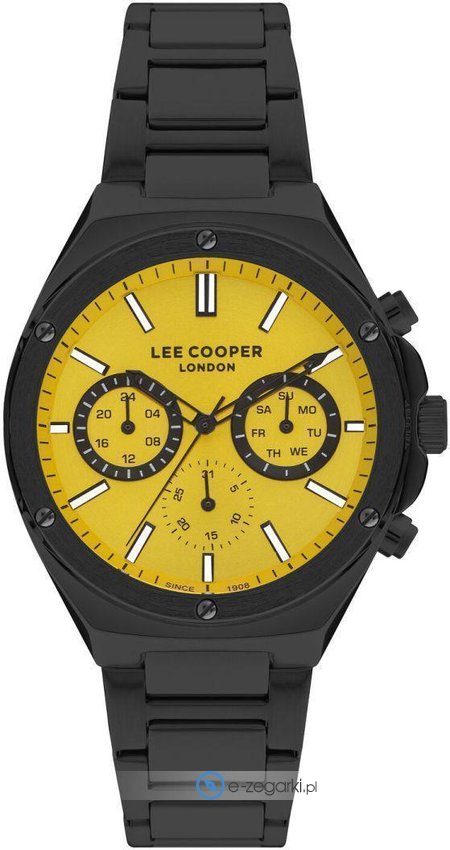 Model LC07845.610 marki Lee Cooper to gustowny zegarek naręczny męski, który wyposażono w ciekawe rozwiązania i funkcje. Stylu nadaje wysokiej klasy tarcza w kolorze żółtym. Zegarek ten prezentuje aktualny czas w formacie analogowym dzięki temu odczyt jest intuicyjny. Koperta jest pokryta kolorem czarnym szeroka jest na 45 mm - wyróżnia się okrągłym kształtem.