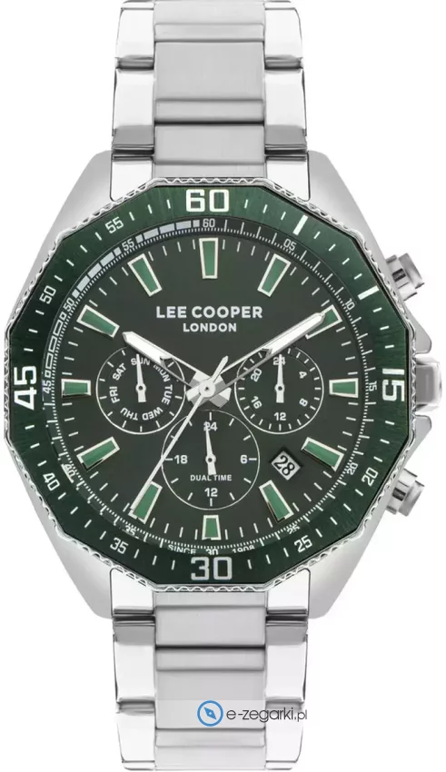 Model LC07847.370 marki Lee Cooper to elegancki zegarek naręczny męski, który wyposażono w pomysłowe rozwiązania oraz funkcje. Charakteru dodaje wysokiej klasy tarcza w kolorze zielonym. Zaprezentowana metodą analogową aktualna godzina jest czytelna i łatwa do sprawdzenia. Koperta jest w kolorze stalowym szeroka jest na 45 mm - charakteryzuje się okrągłym kształtem.