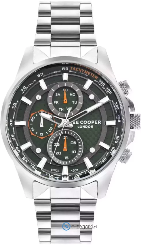 Zegarek męski LC07852.370 marki Lee Cooper to dobra propozycja dla ludzi ceniących sobie dbałość o detale a także bezproblemowe zachowanie mechanizmów. Atrakcyjny wygląd czasomierza uzyskano m.in. poprzez tarczę w kolorze zielonym. Godzina pokazywana jest w sposób analogowy co niezmiernie łatwo pozwala ją odczytać. Koperta w odcieniach koloru stalowego szeroka jest na 45 mm - posiada okrągły kształt.