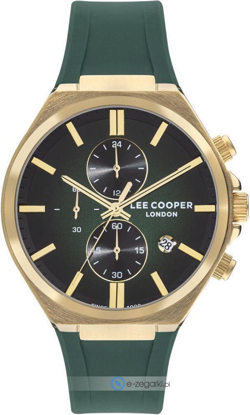 Zegarek męski LC07854.177 marki Lee Cooper to idealne połączenie funkcjonalności oraz ciekawego wzornictwa. Niebanalny wygląd czasomierza uzyskano m.in. poprzez cyferblat w kolorze zielonym. Pokazana metodą analogową bieżąca godzina jest czytelna i prosta do odczytania. Koperta jest w kolorze złotym szeroka jest na 46 mm - ma okrągły kształt.