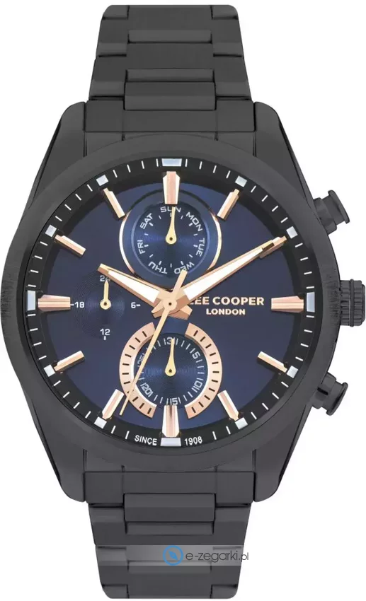 Model LC07947.090 marki Lee Cooper to elegancki zegarek naręczny męski, który posiada pomysłowe rozwiązania i funkcje. Nieschematyczny wygląd czasomierza osiągnięto również dzięki tarczy w kolorze granatowym. Zegarek ten pokazuje aktualny czas w formacie analogowym dzięki temu odczyt jest intuicyjny. Koperta szeroka jest na 45 mm - ma okrągły kształt.