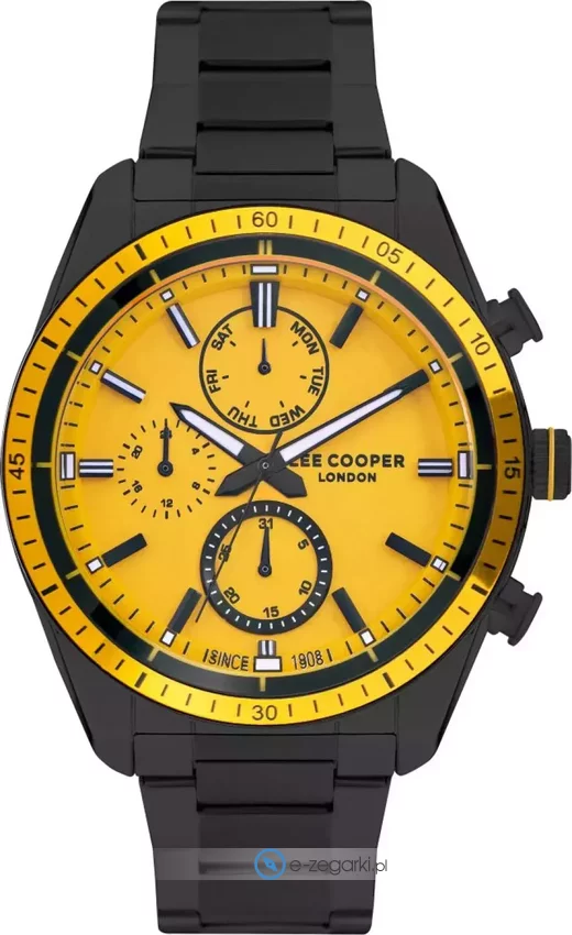 Zegarek męski LC07949.610 marki Lee Cooper to dobre połączenie funkcjonalności i modnego designu. Atrakcyjny wygląd czasomierza osiągnięto m.in. poprzez cyferblat w kolorze żółtym. Zaprezentowana metodą analogową bieżąca godzina jest czytelna i łatwa do odczytania. Koperta jest w kolorze czarnym szeroka jest na 45 mm - w kształcie okrągłym.