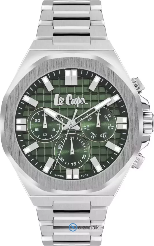Model LC07982.370 marki Lee Cooper to stylowy zegarek naręczny męski, który wyposażono w ciekawe rozwiązania i funkcje. Atrakcyjną budowę zegarka osiągnięto z pomocą tarczy w kolorze zielonym. Godzina przedstawiona jest w sposób analogowy co intuicyjnie pozwala ją odczytać. Koperta jest w kolorze stalowym szeroka jest na 46 mm - charakteryzuje się okrągłym kształtem.