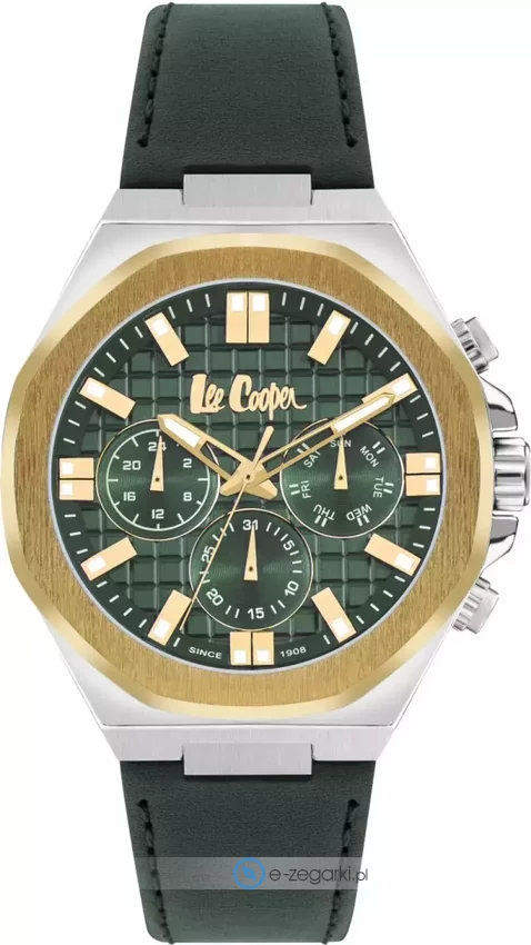 Model LC07983.277 marki Lee Cooper to stylowy zegarek naręczny męski, który jest wyposażony w ciekawe rozwiązania oraz funkcje. Niestereotypowy wygląd czasomierza osiągnięto także dzięki tarczy w kolorze zielonym. Zaprezentowana metodą analogową bieżąca godzina jest czytelna i szybka do sprawdzenia. Koperta szeroka jest na 46 mm - w kształcie okrągłym.