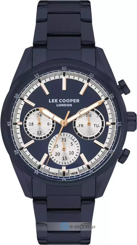 Zegarek męski LC07986.990 marki Lee Cooper to stylowe połączenie funkcjonalności oraz ciekawego wzornictwa. Wysokiej jakości tarczę zegarka pokryto granatowym kolorem. Godzina przedstawiona jest w sposób analogowy co bez trudu pozwala ją odczytać. Koperta szeroka jest na 44 mm - posiada okrągły kształt.