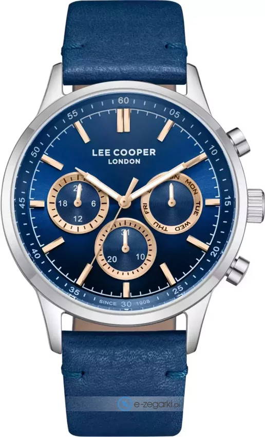 Męski zegarek Lee Cooper LC08001.599 to zegarek, który dzięki swemu wzornictwu zawsze będzie prezentował się dobrze. Charakterystyczną konstrukcję zegarka uzyskano dzięki tarczy w kolorze granatowym. Zegarek ten pokazuje aktualny czas w formacie analogowym dzięki czemu odczyt jest bardzo łatwy. Koperta w barwach koloru stalowego szeroka jest na 44 mm - posiada okrągły kształt.