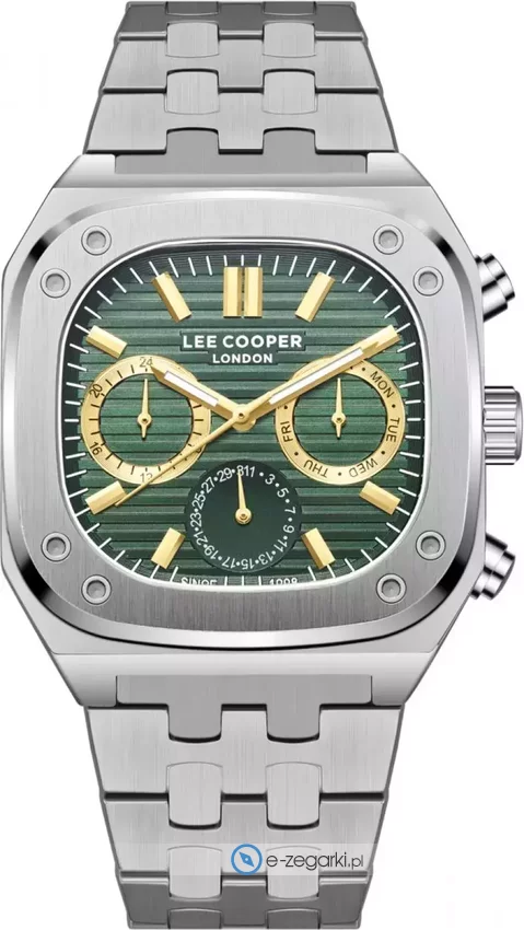 Męski zegarek Lee Cooper LC08023.370 to zegarek, który dzięki swemu wzornictwu zawsze będzie prezentował się dobrze. Styl zapewnia wysokiej jakości cyferblat w kolorze zielonym. Pokazana metodą analogową aktualna godzina jest czytelna i szybka do odczytania. Koperta została pokryta kolorem stalowym szeroka jest na 42 mm - cechuje się prostokątnym kształtem.