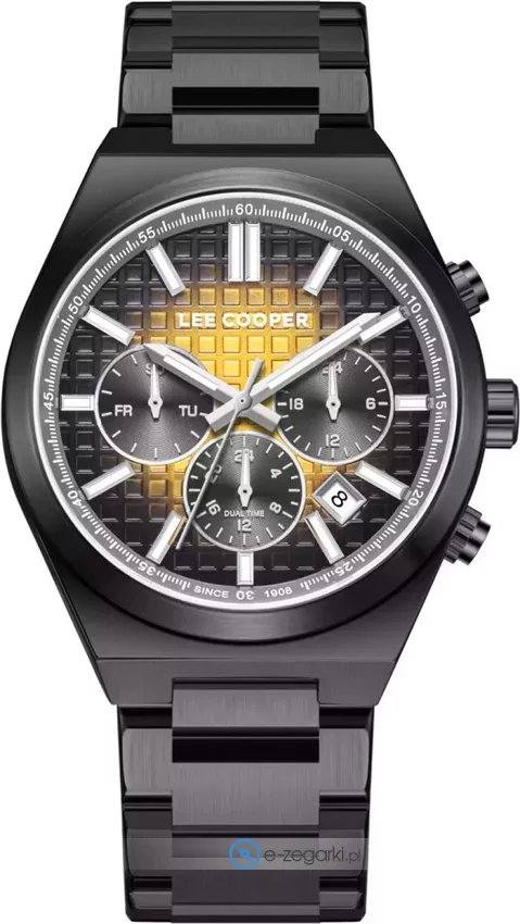 Model LC08084.060 marki Lee Cooper to gustowny zegarek naręczny męski, który wyposażono w pomysłowe rozwiązania oraz funkcje. Ciekawy wygląd czasomierza osiągnięto również dzięki tarczy w kolorze żółtym. Zegarek ten pokazuje aktualny czas w formacie analogowym dzięki czemu odczyt jest bardzo łatwy. Koperta szeroka jest na 41 mm - w kształcie okrągłym.