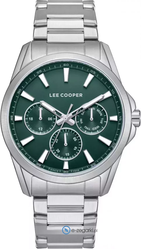 Model LC08105.370 marki Lee Cooper to gustowny zegarek naręczny męski, który posiada ciekawe rozwiązania i funkcje. Nieschematyczny wygląd czasomierza osiągnięto także dzięki tarczy w kolorze zielonym. Zegarek ten pokazuje aktualny czas w formacie analogowym dzięki temu odczyt jest intuicyjny. Koperta została pokryta kolorem stalowym szeroka jest na 42 mm - wyróżnia się okrągłym kształtem.