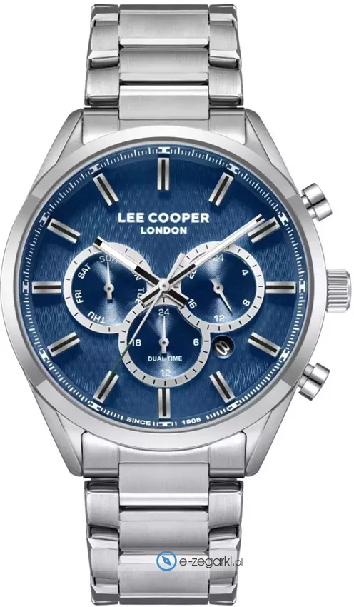 Zegarek męski LC08153.390 marki Lee Cooper to ciekawa pozycja dla osób ceniących sobie dbałość o szczegóły jak również bezawaryjne zachowanie mechanizmów. Nieschematyczny wygląd zegarka uzyskano m.in. poprzez cyferblat w kolorze granatowym. Zegarek ten pokazuje aktualny czas w formacie analogowym dzięki temu odczyt jest intuicyjny. Koperta w barwach koloru stalowego szeroka jest na 44 mm - posiada okrągły kształt.