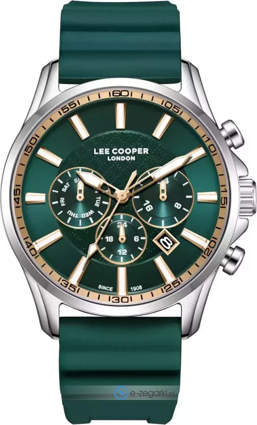 Model LC08170.375 marki Lee Cooper to gustowny zegarek naręczny męski, który posiada ciekawe rozwiązania oraz funkcje. Cyferblat zegarka jest w kolorze zielonym. Zaprezentowana metodą analogową aktualna godzina jest czytelna i szybka do odczytania. Koperta została ozdobiona kolorem stalowym szeroka jest na 44 mm - ma okrągły kształt.