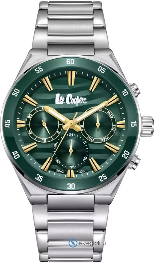 Zegarek męski LC08175.370 marki Lee Cooper to dobre połączenie funkcjonalności a także ciekawego wzornictwa. Nieschematyczny wygląd zegarka osiągnięto również dzięki tarczy w kolorze zielonym. Godzina przedstawiona jest w sposób analogowy co intuicyjnie pozwala ją odczytać. Koperta w barwach koloru stalowego szeroka jest na 43 mm - w kształcie okrągłym.