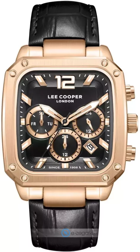 Zegarek męski LC08184.451 marki Lee Cooper to dobre połączenie funkcjonalności a także modnego wzornictwa. Cyferblat zegarka jest w kolorze czarnym. Zaprezentowana metodą analogową bieżąca godzina jest czytelna i łatwa do sprawdzenia. Koperta jest pokryta kolorem różowo złotym szeroka jest na 39 mm.