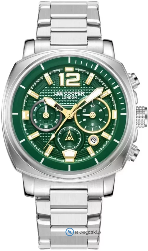 Męski zegarek Lee Cooper LC08194.370 to zegarek, który dzięki swemu wzornictwu zawsze będzie prezentował się dobrze. Charakteru dodaje wysokiej klasy cyferblat w kolorze zielonym. Zegarek ten prezentuje godzinę w formacie analogowym dzięki czemu odczyt jest intuicyjny. Koperta w barwach koloru stalowego szeroka jest na 43 mm - cechuje się okrągłym kształtem.