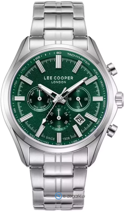 Zegarek męski LC08199.370 marki Lee Cooper to ciekawa pozycja dla osób ceniących sobie dbałość o szczegóły oraz bezproblemowe zachowanie mechanizmów. Tarcza zegarka jest w kolorze zielonym. Pokazana metodą analogową bieżąca godzina jest czytelna i prosta do sprawdzenia. Koperta jest w kolorze stalowym szeroka jest na 44 mm - w kształcie okrągłym.