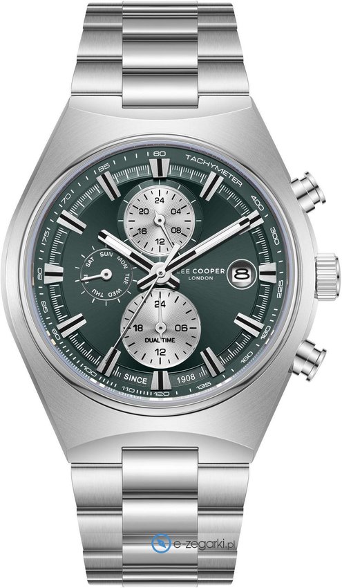 Model LC08214.370 marki Lee Cooper to elegancki zegarek naręczny męski, który wyposażono w ciekawe rozwiązania i funkcje. Charakter zapewnia wysokiej klasy tarcza w kolorze zielonym. Aktualna godzina przedstawiona jest w sposób analogowy co intuicyjnie pozwala ją odczytać. Koperta jest w kolorze stalowym szeroka jest na 43 mm - w kształcie okrągłym.