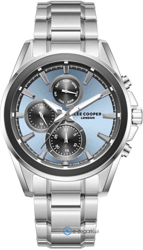Model LC08249.300 marki Lee Cooper to gustowny zegarek naręczny męski, który posiada pomysłowe rozwiązania i funkcje. Ciekawy wygląd czasomierza osiągnięto również dzięki tarczy w kolorze niebieskim. Godzina przedstawiona jest w sposób analogowy co bez trudu pozwala ją odczytać. Koperta w odcieniach koloru stalowego szeroka jest na 44 mm - cechuje się okrągłym kształtem.