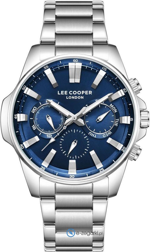 Męski zegarek Lee Cooper LC08253.390 to zegarek, który dzięki swemu wzornictwu zawsze będzie prezentował się dobrze. Wysokiej trwałości tarczę zegarka pokryto granatowym kolorem. Aktualna godzina prezentowana jest w sposób analogowy co niezmiernie łatwo pozwala ją odczytać. Koperta jest w kolorze stalowym szeroka jest na 43 mm - w kształcie okrągłym.