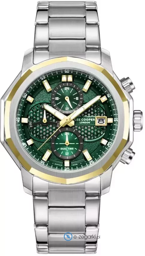 Zegarek męski LC08256.270 marki Lee Cooper to idealne połączenie funkcjonalności a także ciekawego designu. Cyferblat zegarka jest w kolorze zielonym. Aktualna godzina przedstawiona jest w sposób analogowy co niezmiernie łatwo pozwala ją odczytać. Koperta szeroka jest na 43 mm - wyróżnia się okrągłym kształtem.