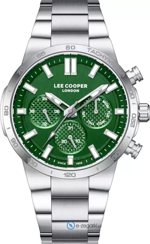 Zegarek męski LC08293.370 marki Lee Cooper to dobre połączenie funkcjonalności oraz modnego wzornictwa. Ciekawą budowę czasomierza uzyskano z pomocą tarczy w kolorze zielonym. Godzina przedstawiona jest w sposób analogowy co intuicyjnie pozwala ją odczytać. Koperta w odcieniach koloru stalowego szeroka jest na 43 mm - cechuje się okrągłym kształtem.