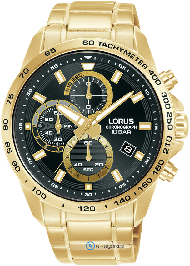 Zegarek męski RM358JX9 marki Lorus to ciekawa pozycja dla osób ceniących sobie dbałość o detale oraz bezproblemowe działanie mechanizmów. Cyferblat zegarka jest w kolorze czarnym. Zaprezentowana metodą analogową aktualna godzina jest czytelna i prosta do odczytania. Koperta jest w kolorze złotym szeroka jest na 43 mm oraz ma grubość 13 mm - w kształcie okrągłym.