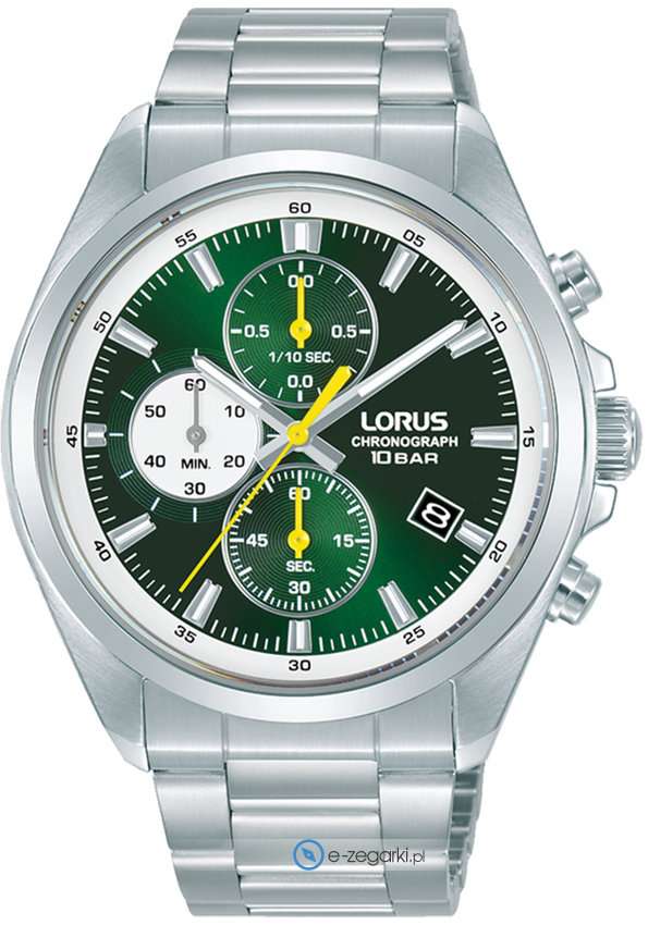 Model RM385JX9 marki Lorus to stylowy zegarek naręczny męski, który posiada pomysłowe rozwiązania i funkcje. Cyferblat zegarka jest w kolorze zielonym. Zaprezentowana metodą analogową bieżąca godzina jest czytelna i szybka do sprawdzenia. Koperta jest w kolorze srebrnym szeroka jest na 42 mm oraz ma grubość 11 mm - w kształcie okrągłym.