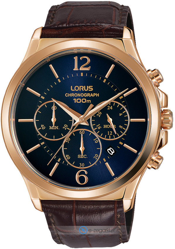 Zegarek męski RT320HX9 marki Lorus to idealna pozycja dla osób ceniących sobie dbałość o szczegóły jak również bezproblemowe zachowanie mechanizmów. Tarcza zegarka jest w kolorze granatowym. Zegarek ten pokazuje aktualny czas w formacie analogowym dzięki temu odczyt jest intuicyjny. Koperta jest w kolorze różowo złotym szeroka jest na 43 mm oraz ma grubość 11.45 mm - cechuje się okrągłym kształtem.