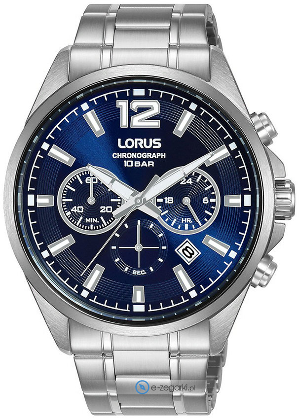 Model RT383JX9 marki Lorus to elegancki zegarek naręczny męski, który posiada pomysłowe rozwiązania oraz funkcje. Charakteru dodaje wysokiej klasy cyferblat w kolorze niebieskim. Pokazana metodą analogową bieżąca godzina jest czytelna i szybka do odczytania. Koperta jest ozdobiona kolorem srebrnym szeroka jest na 43 mm oraz ma grubość 11 mm - ma okrągły kształt.