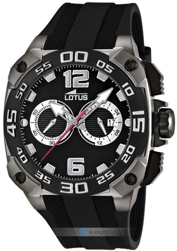 Model L15791-7 marki Lotus to gustowny zegarek naręczny męski, który wyposażono w ciekawe rozwiązania oraz funkcje. Ciekawy wygląd zegarka osiągnięto także dzięki tarczy w kolorze czarnym. Zaprezentowana metodą analogową bieżąca godzina jest czytelna i łatwa do sprawdzenia.