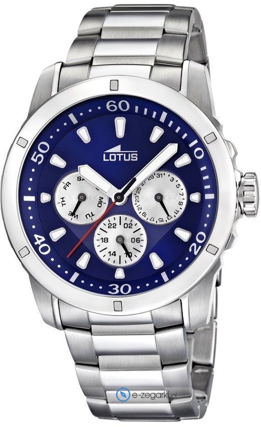 Zegarek męski L15810-2 marki Lotus to idealna propozycja dla osób ceniących sobie dbałość o detale jak również sprawne funkcjonowanie mechanizmów. Niestereotypowy wygląd zegarka osiągnięto także dzięki tarczy w kolorze niebieskim. Aktualna godzina przedstawiona jest w sposób analogowy co intuicyjnie pozwala ją odczytać. Koperta szeroka jest na 45 mm - charakteryzuje się okrągłym kształtem.