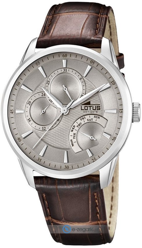 Zegarek męski L15974-2 marki Lotus to dobra pozycja dla ludzi ceniących sobie dbałość o detale oraz sprawne funkcjonowanie mechanizmów. Tarcza zegarka w kolorze szarym. Aktualna godzina pokazywana jest w sposób analogowy co bez trudu pozwala ją odczytać. Koperta szeroka jest na 44 mm - ma okrągły kształt.
