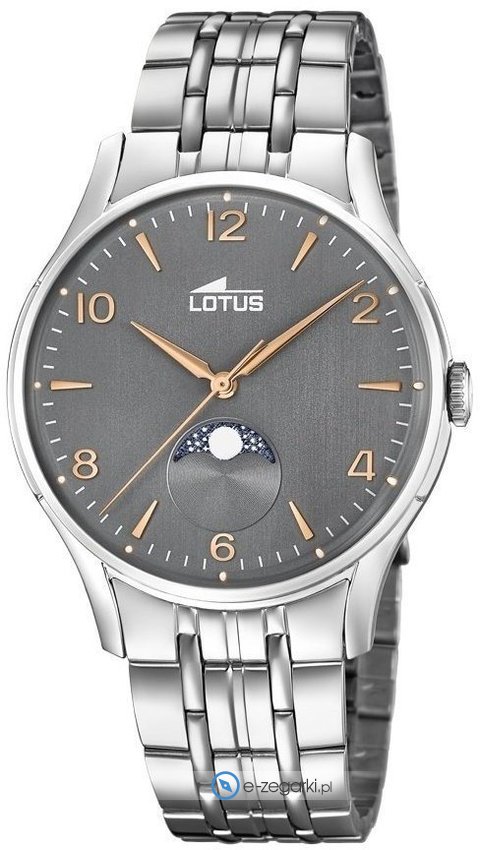Zegarek męski L18425-2 marki Lotus to ciekawa propozycja dla ludzi ceniących sobie dbałość o szczegóły a także bezawaryjne funkcjonowanie mechanizmów. Atrakcyjną stylistykę czasomierza osiągnięto dzięki tarczy w kolorze szarym. Zegarek ten prezentuje aktualny czas w formacie analogowym dzięki temu odczyt jest bezproblemowy. Koperta szeroka jest na 40 mm - posiada okrągły kształt.