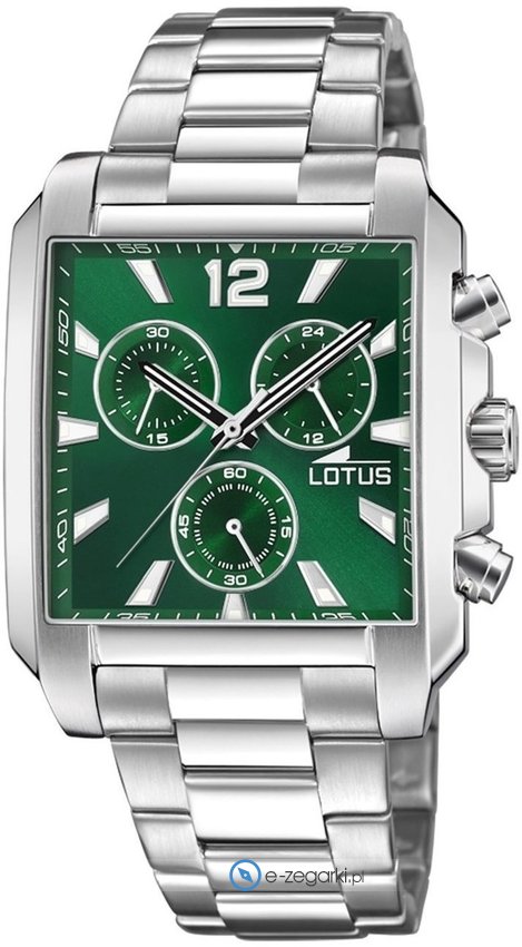 Zegarek męski L18850-3 marki Lotus to stylowe połączenie funkcjonalności oraz ciekawego designu. Charakterystyczną konstrukcję czasomierza uzyskano z pomocą tarczy w kolorze zielonym. Pokazana metodą analogową aktualna godzina jest czytelna i prosta do sprawdzenia. Koperta szeroka jest na 38 mm.