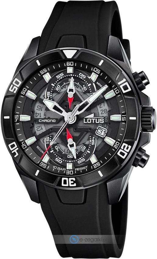 Model L18945-6 marki Lotus to stylowy zegarek naręczny męski, który wyposażono w ciekawe rozwiązania i funkcje. Styl zapewnia wysokiej jakości cyferblat w kolorze czarnym. Aktualna godzina zaprezentowana jest w sposób analogowy co niezmiernie łatwo pozwala ją odczytać. Koperta szeroka jest na 44 mm - ma okrągły kształt.