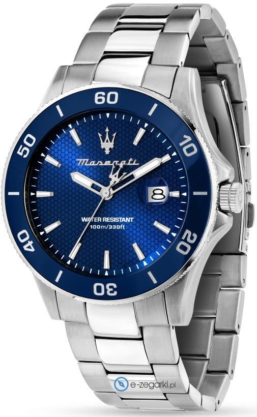 Model R8853100036 marki Maserati to stylowy zegarek naręczny męski, który jest wyposażony w ciekawe rozwiązania i funkcje. Niestereotypowy wygląd czasomierza osiągnięto m.in. poprzez cyferblat w kolorze niebieskim. Zaprezentowana metodą analogową bieżąca godzina jest czytelna i prosta do odczytania. Koperta jest w kolorze srebrnym szeroka jest na 43 mm oraz ma grubość 11 mm - w kształcie okrągłym.
