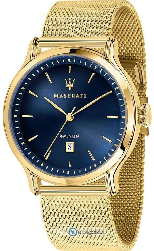 Model R8853118014 marki Maserati to stylowy zegarek naręczny męski, który wyposażono w pomysłowe rozwiązania oraz funkcje. Charakterystyczny wygląd czasomierza osiągnięto m.in. poprzez cyferblat w kolorze niebieskim. Zegarek ten prezentuje aktualny czas w formacie analogowym dzięki czemu odczyt jest bardzo łatwy. Koperta została ozdobiona kolorem złotym szeroka jest na 42 mm oraz ma grubość 12 mm - ma okrągły kształt.