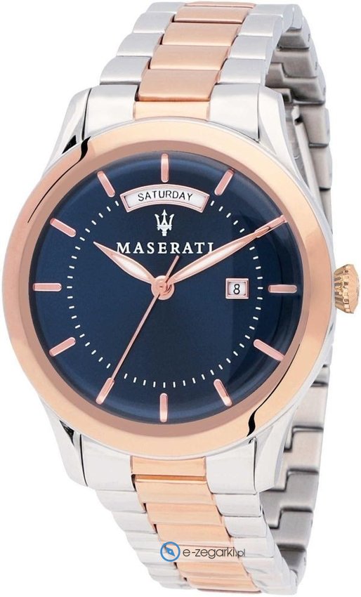 Model R8853125001 marki Maserati to stylowy zegarek naręczny męski, który wyposażono w ciekawe rozwiązania oraz funkcje. Wysokiej trwałości cyferblat zegarka ozdobiono niebieskim kolorem. Zegarek ten pokazuje aktualny czas w formacie analogowym dzięki temu odczyt jest bezproblemowy. Koperta w barwach koloru różowo złotego szeroka jest na 42 mm oraz ma grubość 10 mm - ma okrągły kształt.