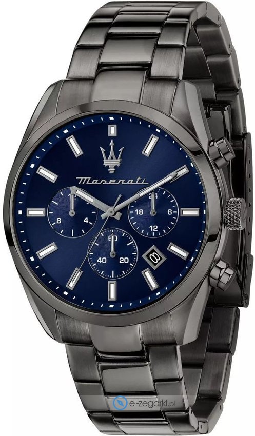 Zegarek męski R8853151012 marki Maserati to idealne połączenie funkcjonalności oraz modnego wzornictwa. Wysokiej trwałości cyferblat zegarka pokryto niebieskim kolorem. Aktualna godzina prezentowana jest w sposób analogowy co intuicyjnie pozwala ją odczytać. Koperta została ozdobiona kolorem szarym szeroka jest na 43 mm oraz ma grubość 10 mm - w kształcie okrągłym.