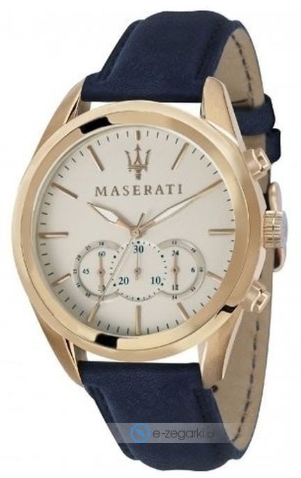 Zegarek męski R8871612016 marki Maserati to idealne połączenie funkcjonalności a także modnego designu. Wysokiej jakości cyferblat zegarka pokryto beżowym kolorem. Godzina przedstawiona jest w sposób analogowy co bez trudu pozwala ją odczytać. Koperta jest w kolorze złotym szeroka jest na 45 mm oraz ma grubość 13 mm - w kształcie okrągłym.