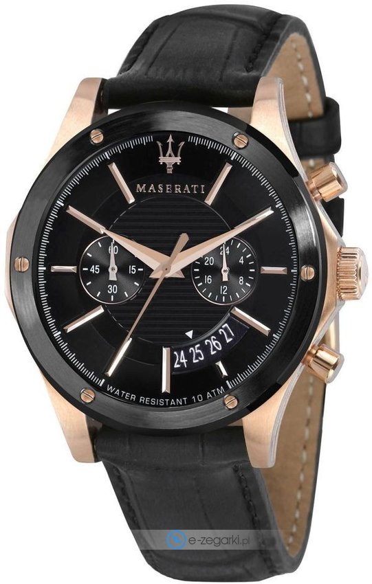 Zegarek męski R8871627001 marki Maserati to dobra propozycja dla osób ceniących sobie dbałość o detale jak również bezproblemowe zachowanie mechanizmów. Niebanalną konstrukcję zegarka uzyskano z pomocą tarczy w kolorze czarnym. Zaprezentowana metodą analogową aktualna godzina jest czytelna i prosta do sprawdzenia. Koperta w barwach koloru różowo złotego szeroka jest na 44 mm oraz ma grubość 12 mm - posiada okrągły kształt.