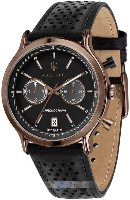 Model R8871638001 marki Maserati to stylowy zegarek naręczny męski, który posiada pomysłowe rozwiązania oraz funkcje. Charakterystyczny wygląd czasomierza osiągnięto m.in. poprzez cyferblat w kolorze czarnym. Zegarek ten pokazuje aktualny czas w formacie analogowym dzięki temu odczyt jest bardzo łatwy. Koperta szeroka jest na 42 mm oraz ma grubość 10 mm - w kształcie okrągłym.