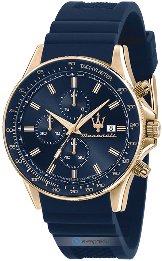 Zegarek męski R8871640004 marki Maserati to dobre połączenie funkcjonalności i ciekawego wzornictwa. Charakter zapewnia wysokiej jakości cyferblat w kolorze granatowym. Zegarek ten prezentuje godzinę w formacie analogowym dzięki czemu odczyt jest bezproblemowy. Koperta jest w kolorze złotym szeroka jest na 44 mm oraz ma grubość 11 mm - w kształcie okrągłym.