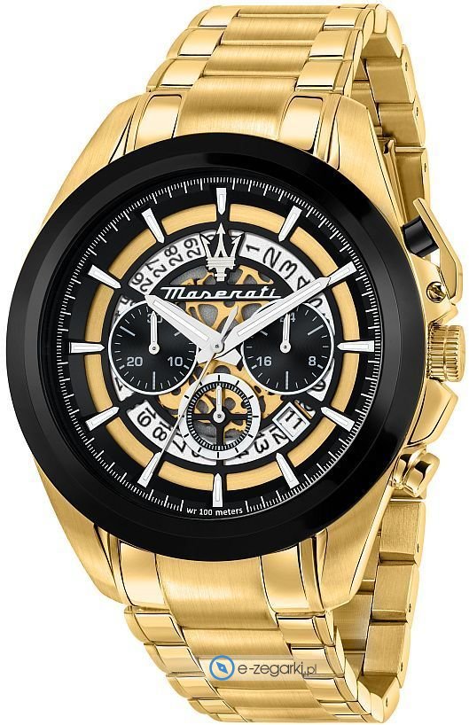 Zegarek męski R8873612058 marki Maserati to idealne połączenie funkcjonalności a także ciekawego wzornictwa. Charakter zapewnia wysokiej klasy cyferblat w kolorze czarnym. Zegarek ten pokazuje aktualny czas w formacie analogowym dzięki czemu odczyt jest bardzo łatwy. Koperta jest w kolorze złotym szeroka jest na 45 mm - ma okrągły kształt.